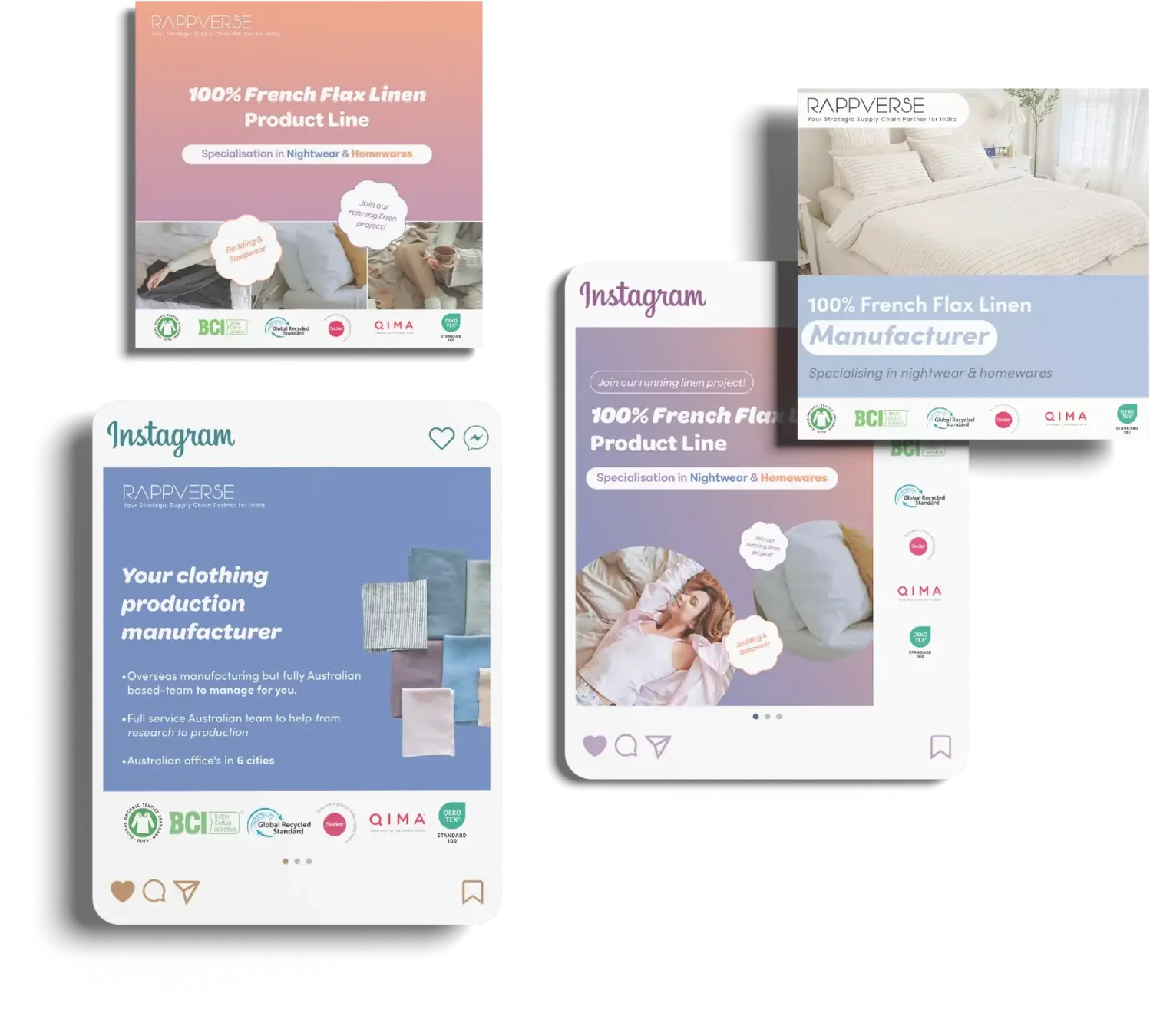 We developed compelling social media ads highlighting Rappverse’s unique selling points, such as their expertise in sample development, tech pack creation, and quality inspection. The ads were designed to attract high-quality leads by emphasizing the benefits of their high-quality, sustainable, and compliant manufacturing processes.
